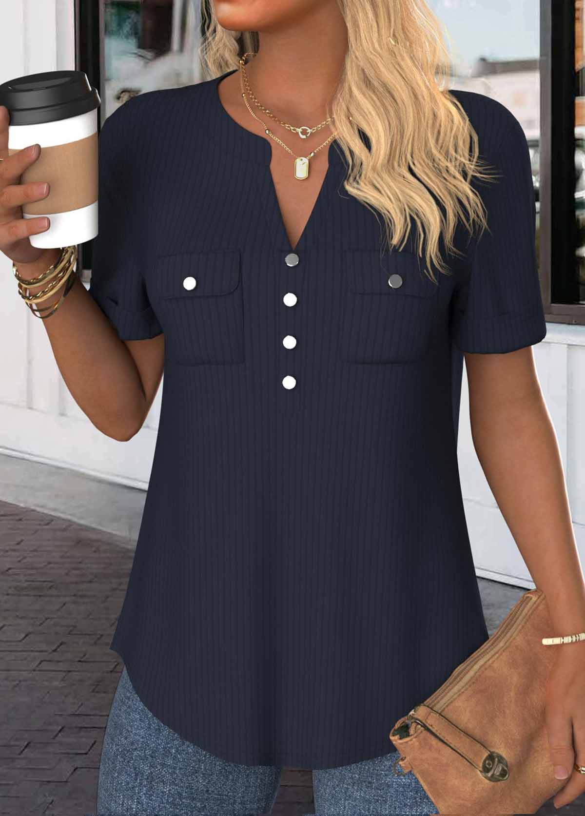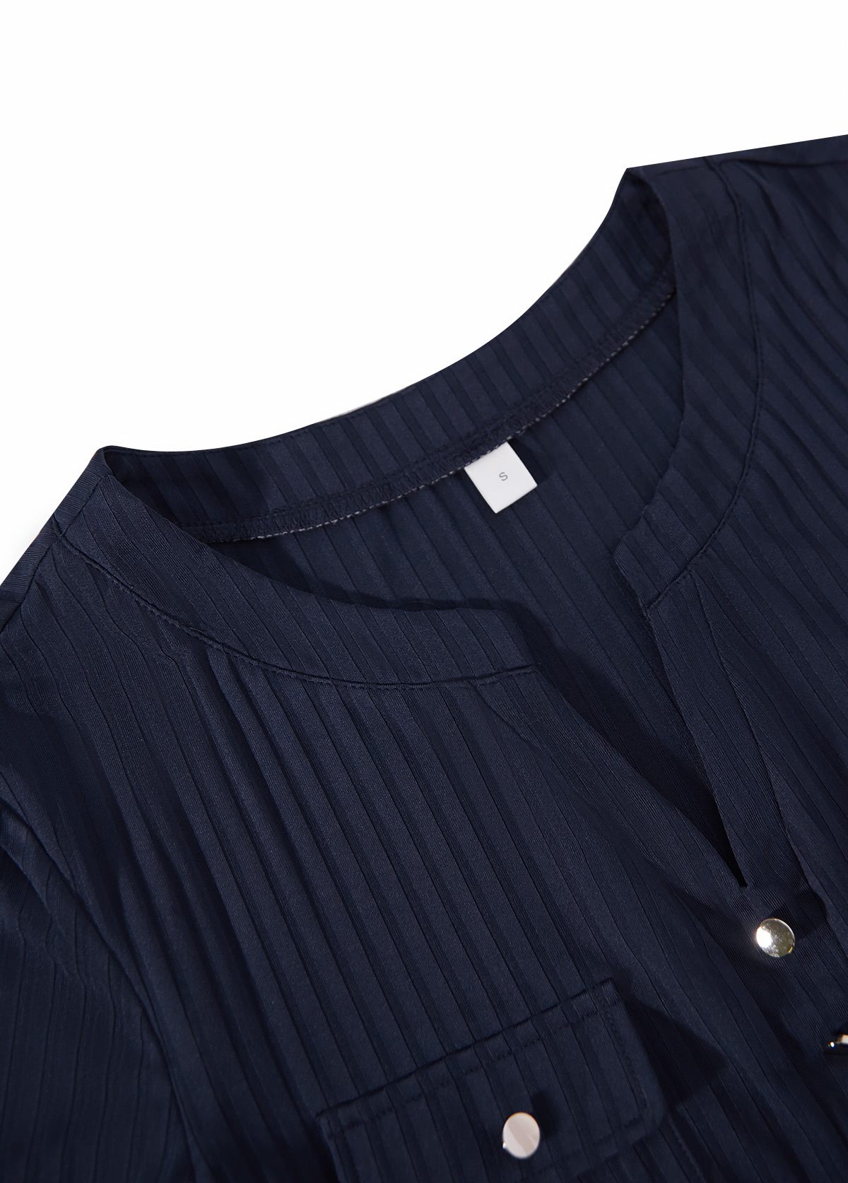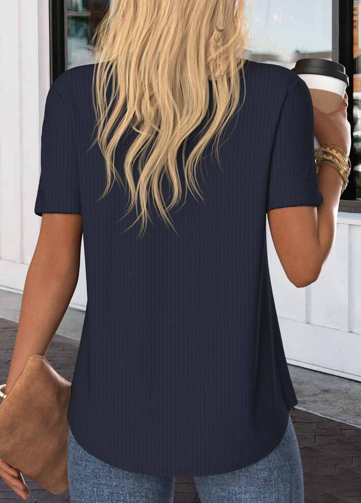 Elevate your everyday wardrobe with this navy split neck tunic. The sleek, solid color exudes sophistication, while decorative buttons at the collar add a touch of elegance. Its medium length offers a flattering silhouette, perfect for concealing the midsection. Ideal for both casual and workwear, this versatile piece seamlessly blends style with comfort.
