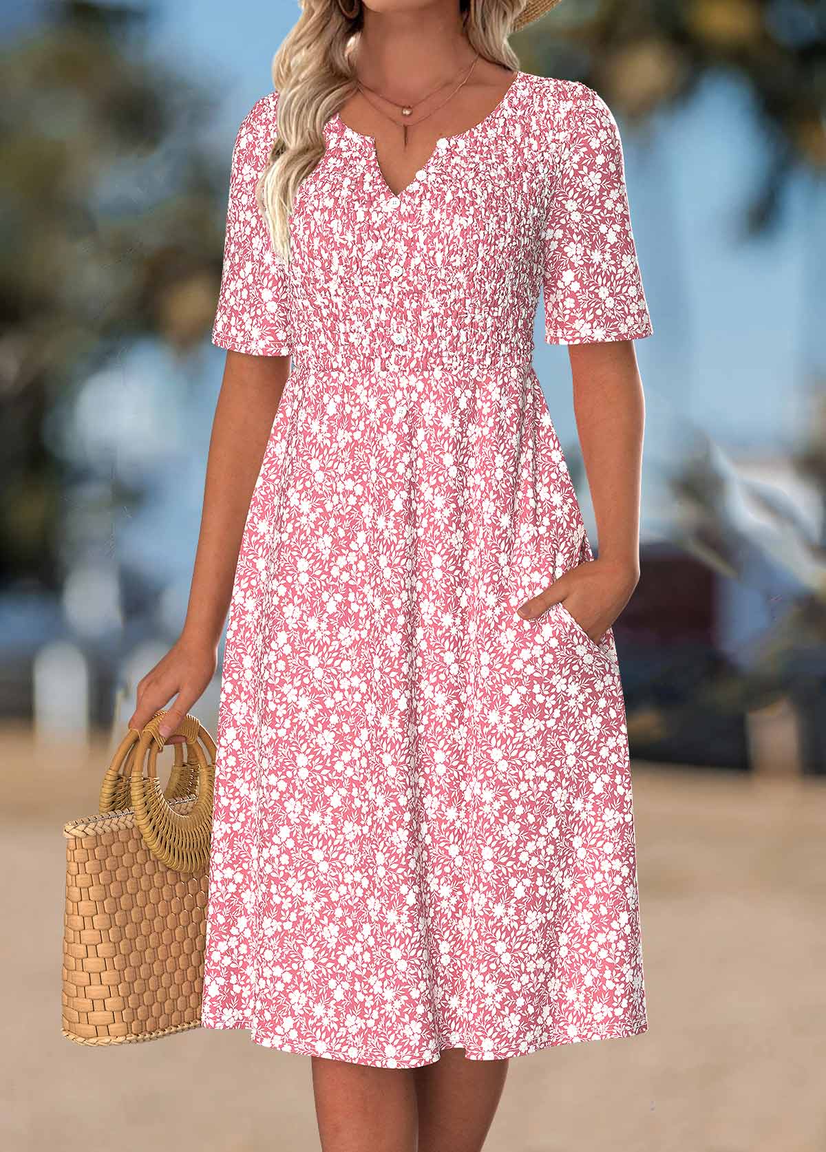 NEW IN Floral Print Smocked Pink Short Sleeve Split Neck Dress