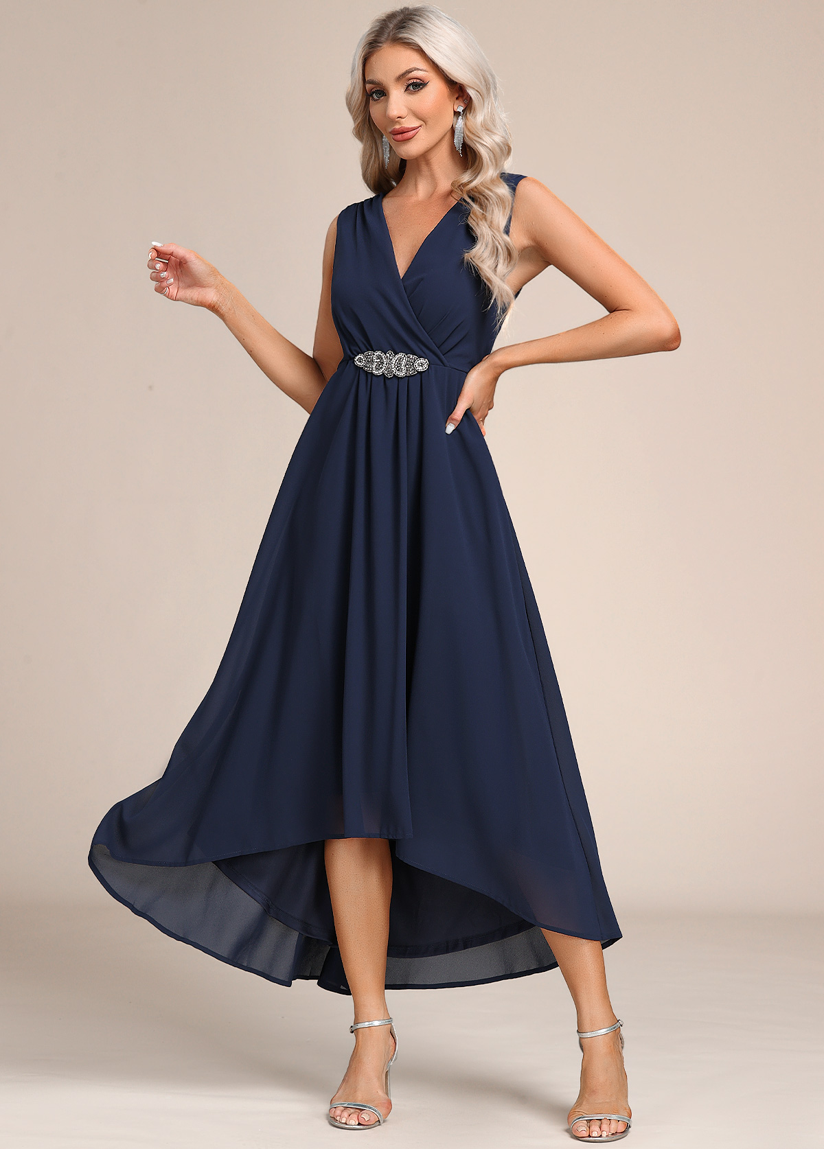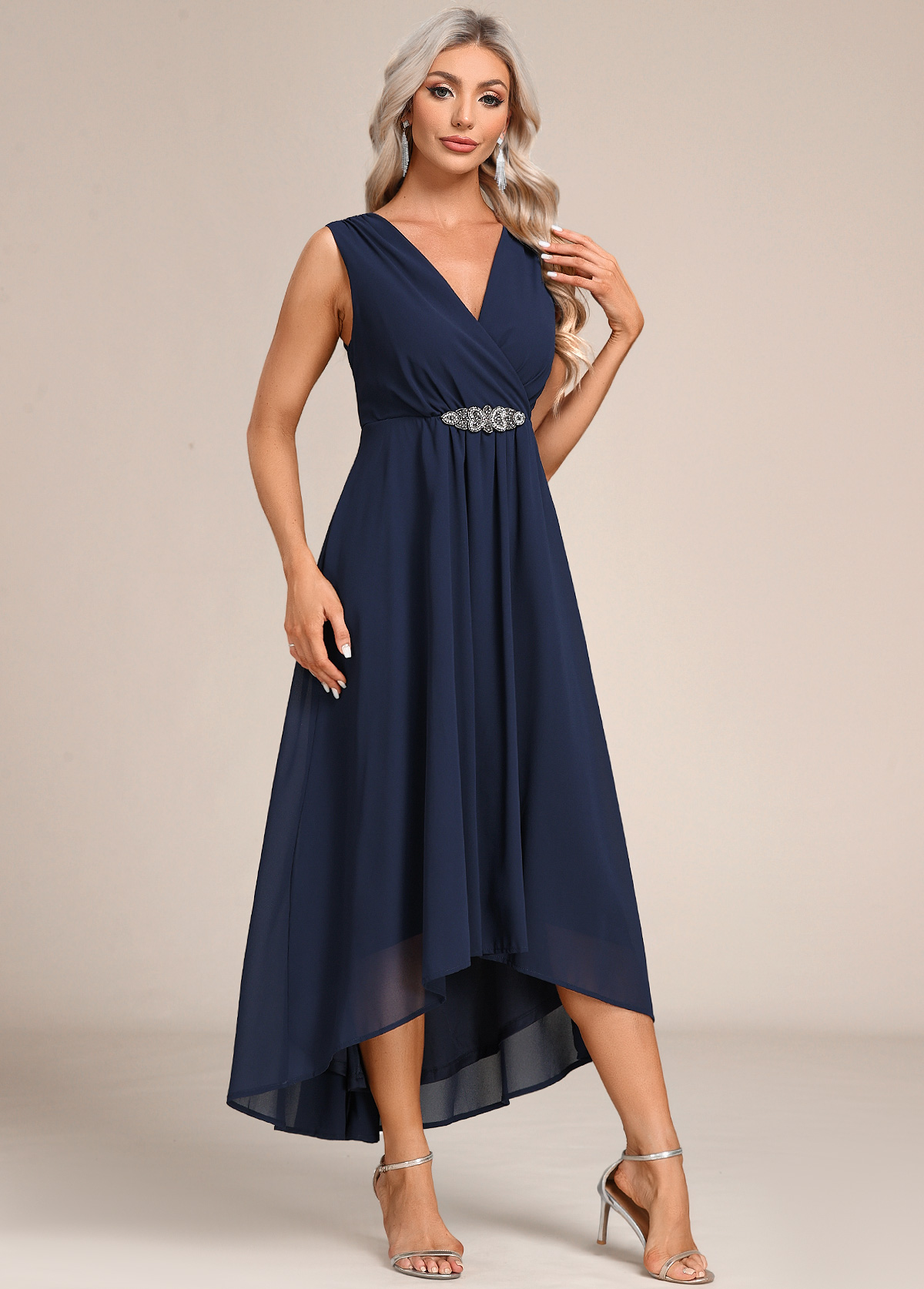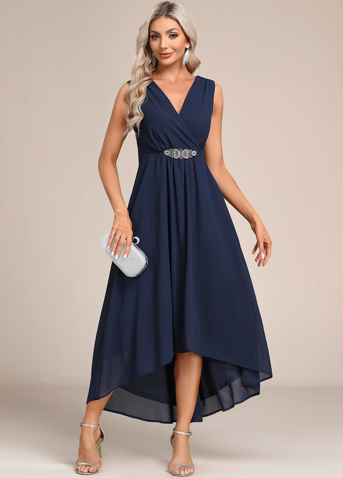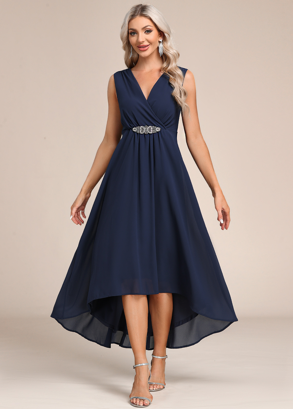 Home/Share/Sleeveless V Back High Low Navy Blue Dress