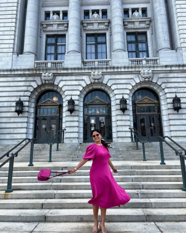 Home/Share/New Year Umbrella Hem Round Neck Hot Pink Dress