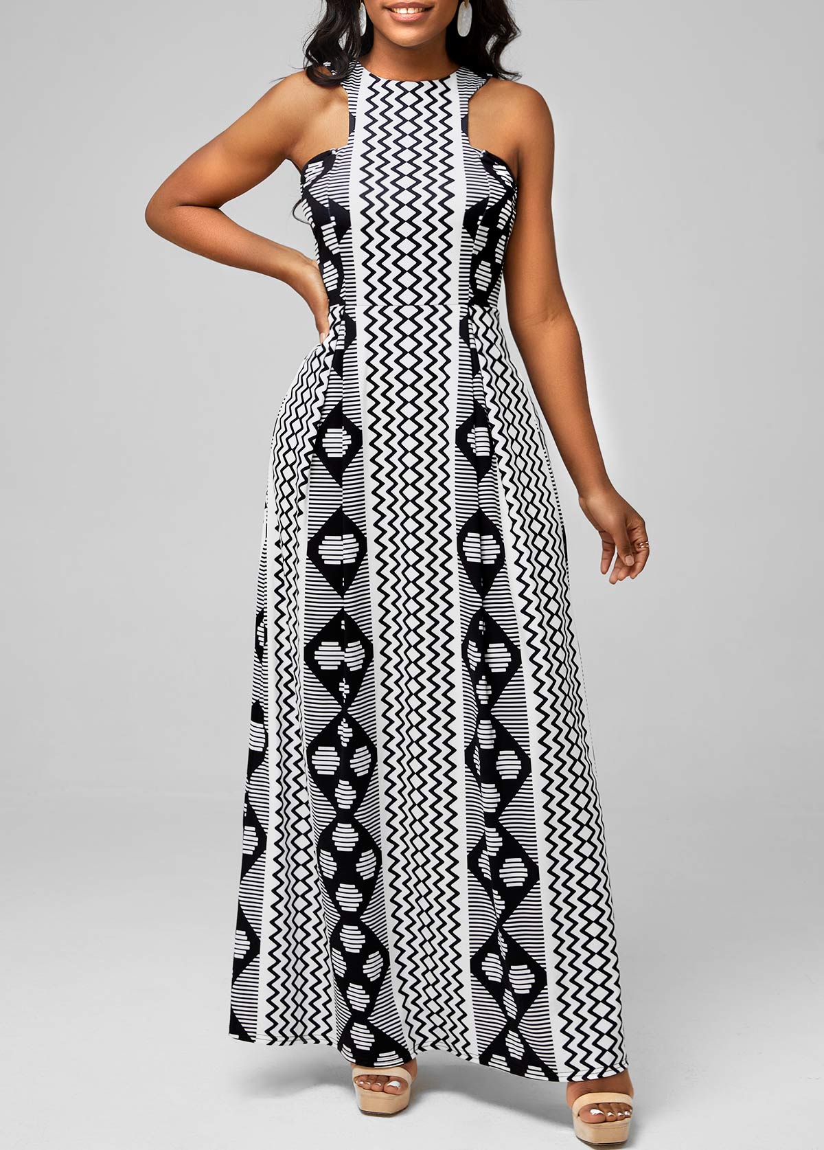 Geometric Print Black Maxi Sleeveless Round Neck Dress